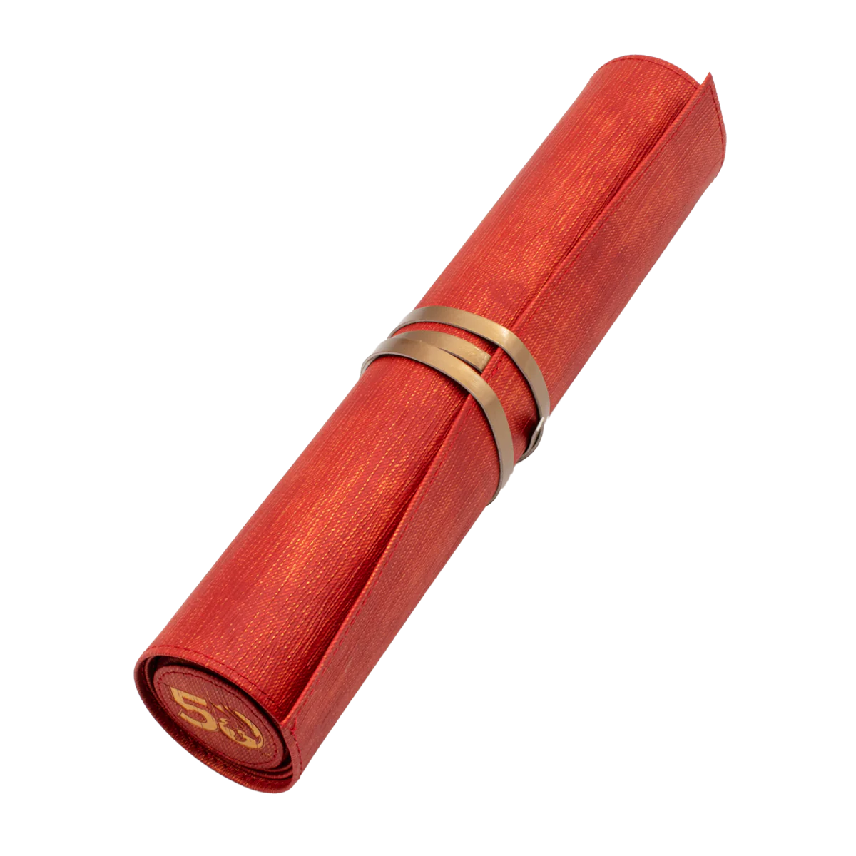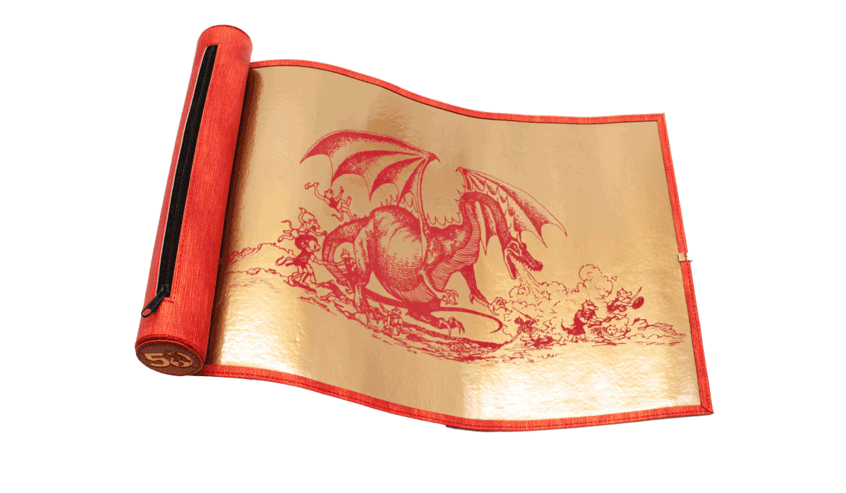 The Dice Scroll offers premium dice storage and functions as a dice rolling mat. Made with a durable leatherette exterior and soft microfiber interior, your favorite dice will be stored safely and your table protected when rolling on this soft roll-out mat. The zippered compartment holds 20+ dice on average, and each 50th Anniversary dice scroll reveals a red holofoil dragon design when unrolled for an iconic surprise! The rolling mat rolls up into a scroll around the zippered compartment and is secured shut with a single tie to look like an ancient leather-bound scroll. Great for your next role-playing game, D&D session, or cosplay!