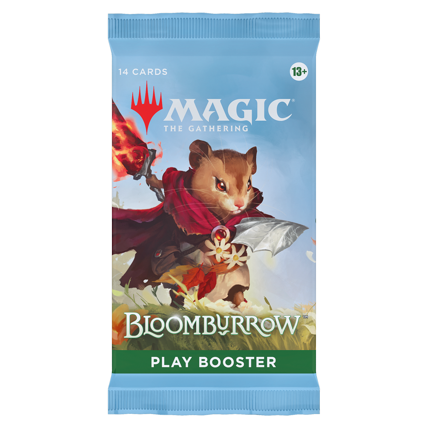 Perfect for both Limited play and opening packs just for fun, this Bloomburrow Play Booster contains 14 Magic: The Gathering cards and 1 Token/Ad card or Art card. (A regular Art card can be found in 30% of packs and a foil-stamped Signature Art card can be found in 5% of packs.) Each pack includes a combination of 1–4 cards of rarity Rare or higher and 3–5 Uncommon, 6–9 Common, and 1 Land cards. One card of any rarity is Traditional Foil. The Land card is also Traditional Foil in 20% of boosters. Foil Borderless Mythic Rare Planeswalker in <1% of boosters.
