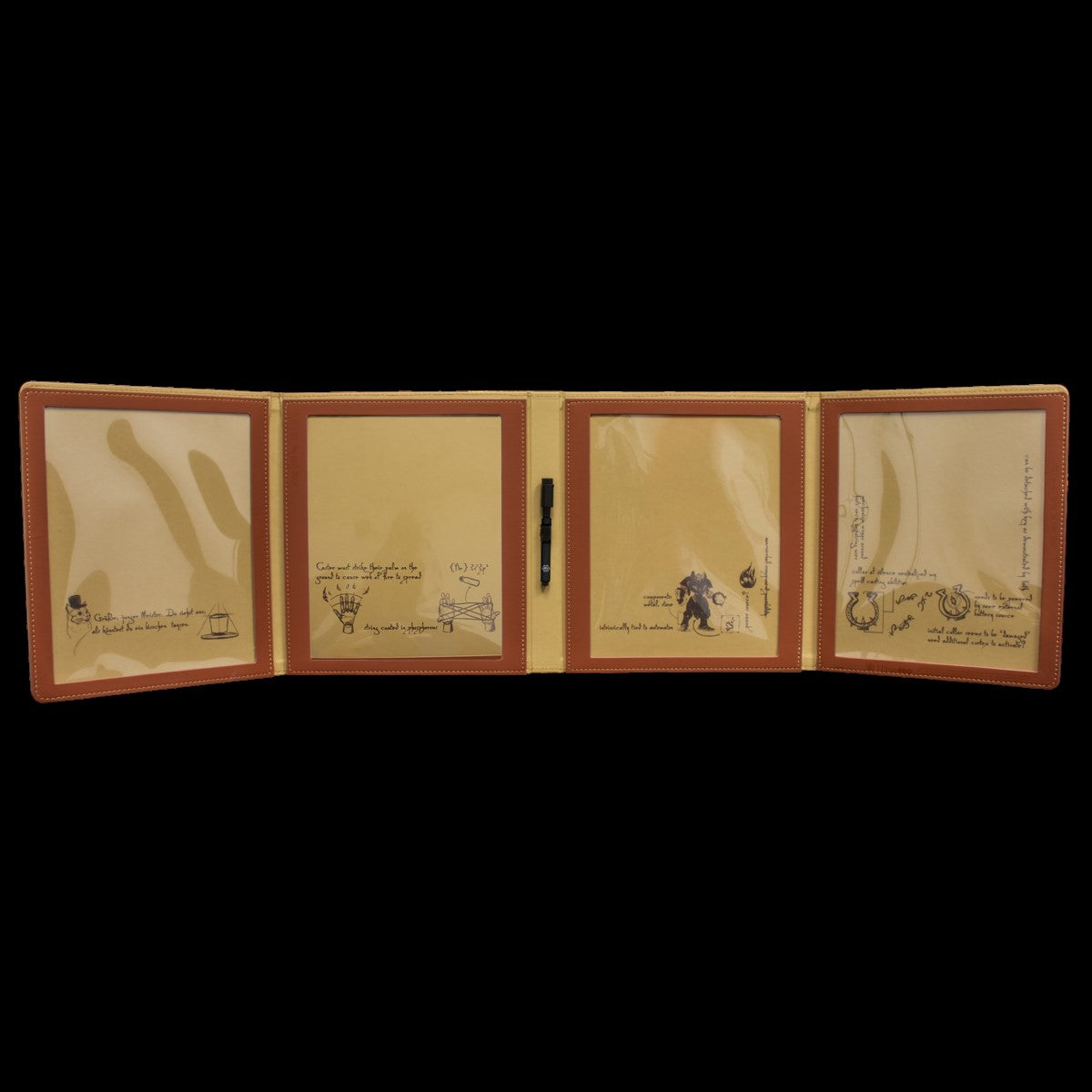Master your campaign like a true wizard with the Game Master Spell Book, a multi-use table screen inspired by Caleb Widogast's own book of spells from Critical Role's Mighty Nein! Frumpkin's paw prints grace the front and back covers, which feature bronze faux book corners and book straps to create a realistic tomb look. Open this well-worn spell book screen to find even more detail inside: Caleb's notes, stories, spells, and doodles are scribbled within the bottom interior of each of the four gusseted pocket pages, with secret hidden messages from Jester scattered around the edges in invisible ink that can only be revealed with the right light! Each screen includes four unique pages of static-cling reusable stickers to help you organize your sessions, with character stickers of officially licensed Mighty Nein artwork. Draw maps, plot movement, or take notes directly on the clear, write-on pockets using the included dry-erase marker, and store up to ten A4 or 8.5 x 11 sized paper sheets inside each one, or hold papers outside the pockets using the 8 included initiative tracker clips. A hidden magnetic closure attaches within the tri-fold screen so it folds flush to save space.