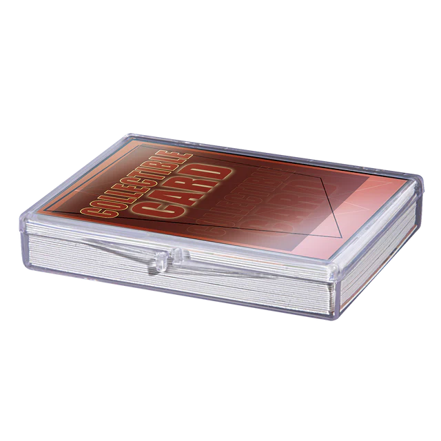 All clear collectible cardholder with snap-lock closure. Holds 25 standard size and thickness cards. (Cards not included)