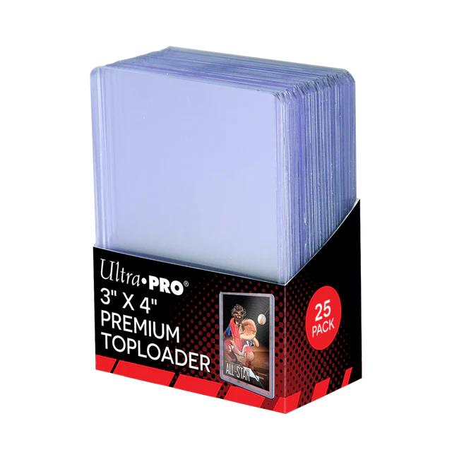 Protect and display your cards with Ultra PRO's 3" x 4" Ultra Clear Premium Toploaders made with 15 gauge thick PVC sheets. The PVC sheets used in these Premium Toploaders contain high-quality additives that both enhance the protection and clarity of the plastic. These Toploaders have overall dimensions of 3" x 4", are made to fit standard size (2.5" x 3.5") trading cards up to 35 pts in thickness, and keep them clean while preventing damage. Each pack contains 25 individual Toploaders.